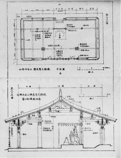第二个案例是五台山佛光寺的文殊殿。该殿建于金代天会十五年(公元1137年)。1937年,梁思成先生带着林徽因先生、莫宗江先生去佛光寺测绘时也测量了文殊殿(图②)。测绘之后,梁思成先生说文殊殿匠人对物料的把握、对大跨度的实现有特别卓越的想法。