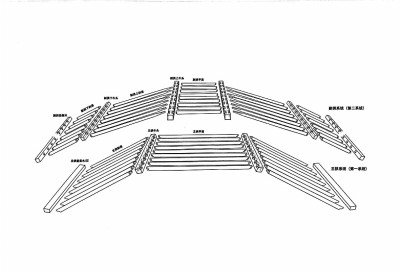 我们在观察明清早期、18世纪以前的桥梁时,经常会发现它们存在一种毛病:桥梁主拱牛头的位置并没有严密地压在副拱的斜苗上。换言之就是编织不够紧密,这个问题被称为耸肩,一旦出现这个问题,桥梁就容易发生活动甚至损坏。另外,桥梁副拱的斜苗也可能出现类似问题。对于编木拱桥而言,如果编织不紧密,就有倒塌的风险。对此,这一时期的工匠们有自己的解决办法——他们在副拱的上斜苗与副拱的上牛头连接的地方,让上斜苗穿透牛头出来。上斜苗进入牛头的孔眼要么留有肩膀,随着修理逐步压紧;要么不做肩膀,使其逐渐能够自然压紧。也就是说,在安装桥梁过程中,匠人会把主拱的牛头和副拱的上牛头绑在一起,用绳子摽、用撬棍撬、用锤子敲,用各种方法使其越束越紧,让这两个牛头能够紧密地贴在苗杆上,最终实现桥梁的稳固,这就是建筑工艺的改进。