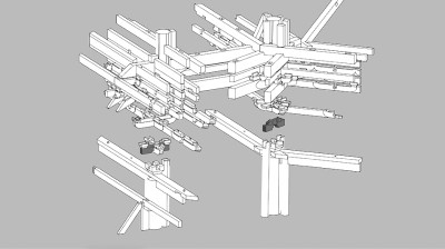 第四个因素是木塔内通长的阑额(图④)和普拍方(图⑤)。应县木塔的每一面有三大间,理论上中国古建每一间都是独立的单元,阑额也是一根一根的。阑额之上是普拍方,普拍方分段并不新奇,而在应县木塔中,普拍方往往是一整根。还有立柱,一面的四根立柱分出三间,一旦阑额穿过立柱头,相应的许多细部结构就会发生变化。我们将这组阑额、普拍方、立柱的结构单独抽出来观察会发现,立柱脚下分叉,叉在平坐斗拱里面,允许它摆动。阑额和普拍方则是一整根,阑额会穿过立柱的头,而立柱和上层斗拱的结合不像普通地面上的单层建筑那样,立柱头出栌斗榫直接插住栌斗,而是被阑额所穿透。这一方面保证了这一面的完整性,另一方面也为空间施工提供了便利,可以略微调整栌斗间距,允许立柱施工的误差稍大一些。这是一个非常巧妙的设计,既便于施工,又增强了木塔每边的整体性。