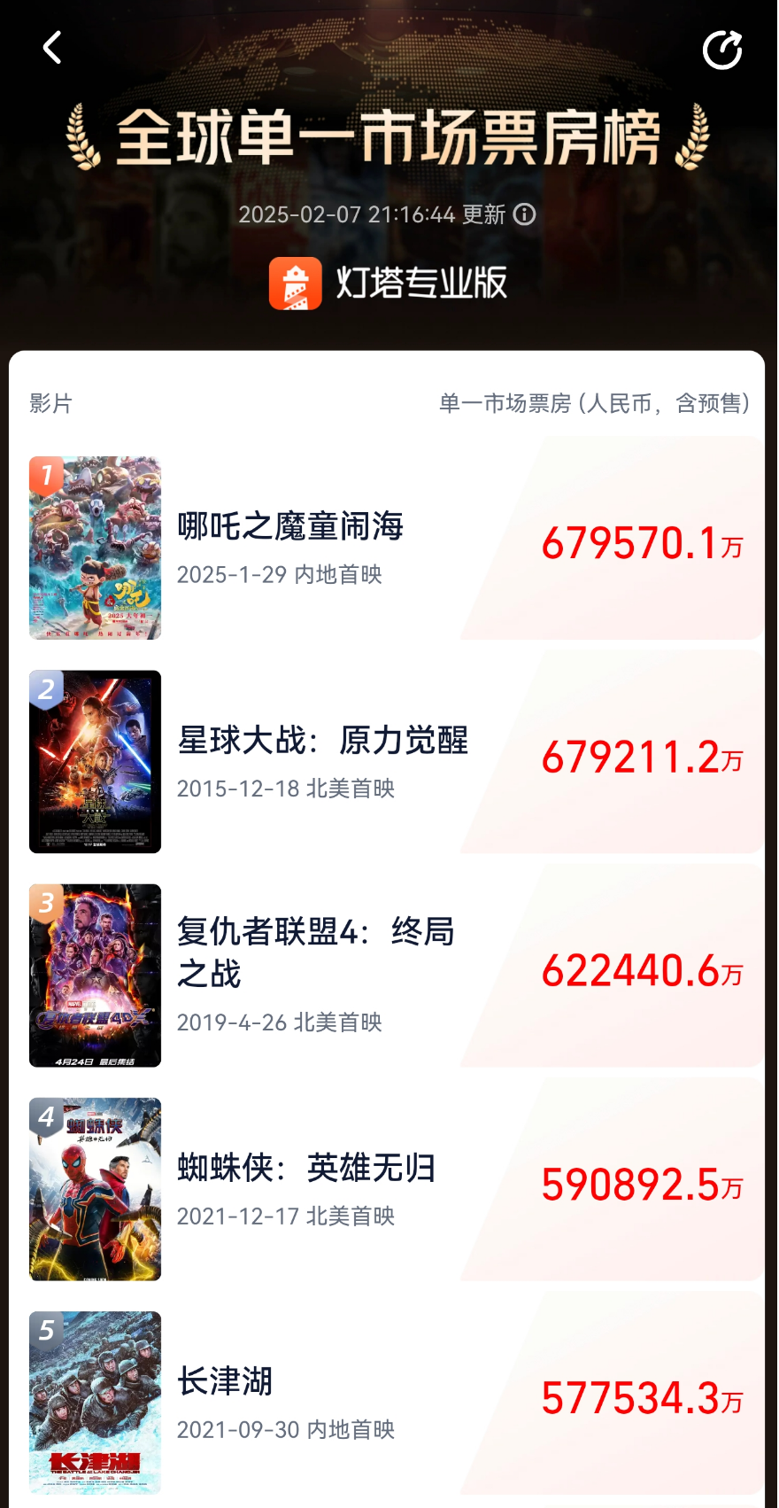 昨晚9点左右,《哪吒2》票房(含预售)反超《星球大战:原力觉醒》票房成绩,登顶全球单一市场票房榜!