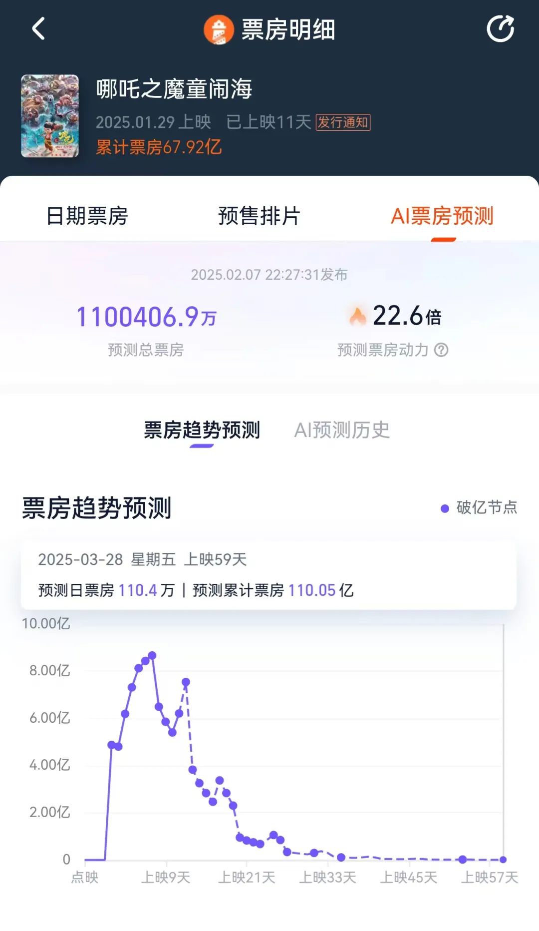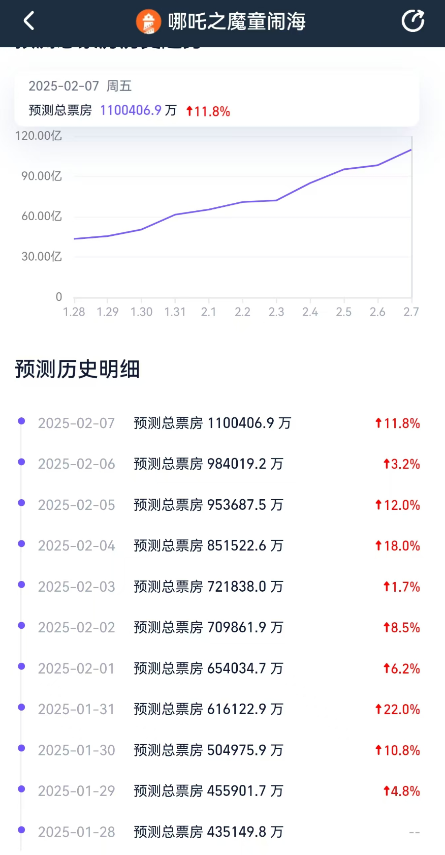 预测历史明细显示,《哪吒2》的预测总票房一直在上升趋势。