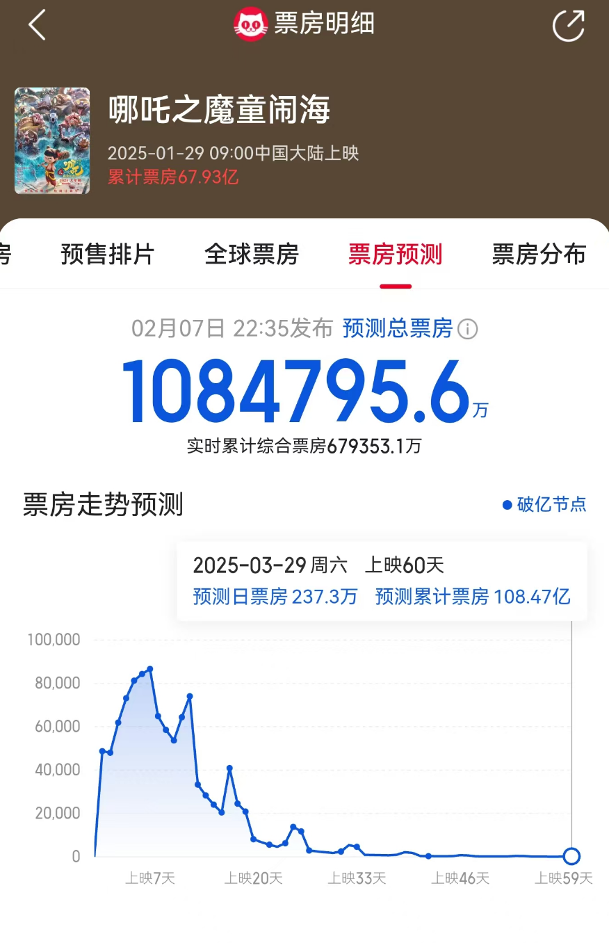 截至今早8点,“猫眼”平台预测《哪吒2》总票房为108.5亿,“灯塔”平台预测的结果为110亿。