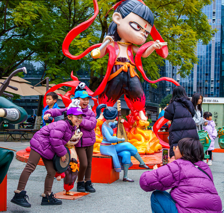 游客在成都与哪吒雕塑合影(C视觉摄影师 袁义明 摄)