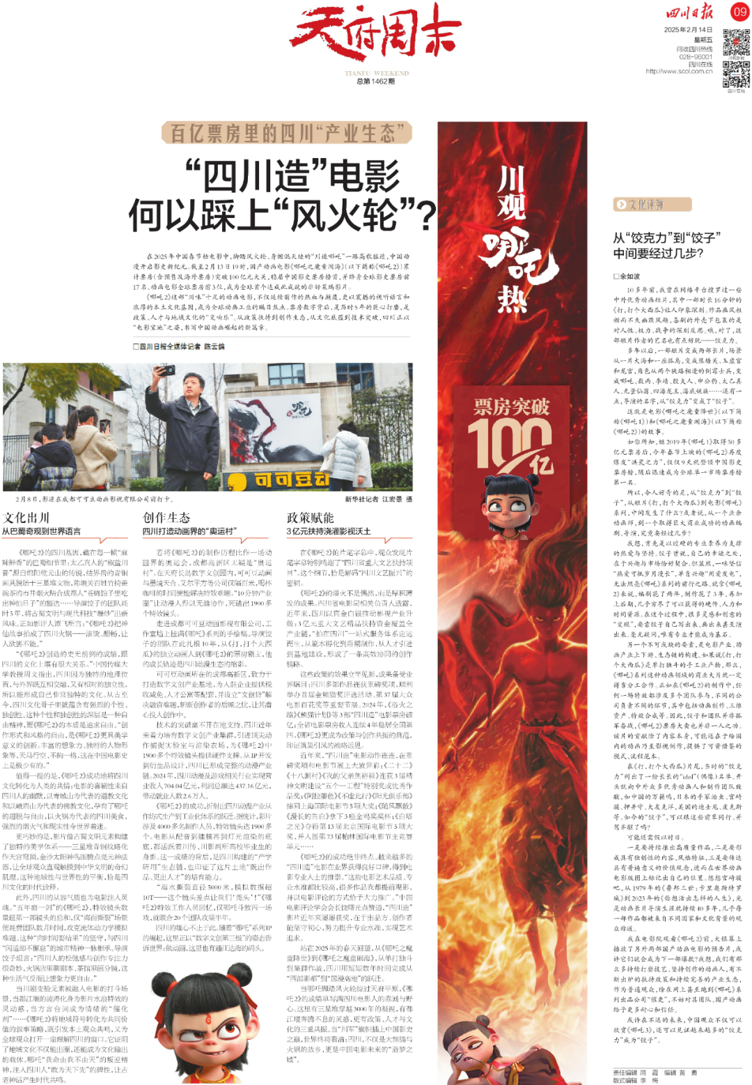 “《哪吒2》创造的史无前例的成绩,跟四川的文化土壤有很大关系。”中国传媒大学教授周文指出,四川因为独特的地理位置,与外界既互相交融,又有相对的独立性,所以能形成自己非常独特的文化。从古至今,四川文化骨子里就蕴含有强烈的个性、独创性。这种个性和独创性的深层是一种自由精神,而《哪吒2》的本质是追求自由。“创作形式和风格的自由,是《哪吒2》更具美学意义的创新。丰富的想象力、独特的人物形象等,天马行空、不拘一格,这在中国电影史上是极少有的。”