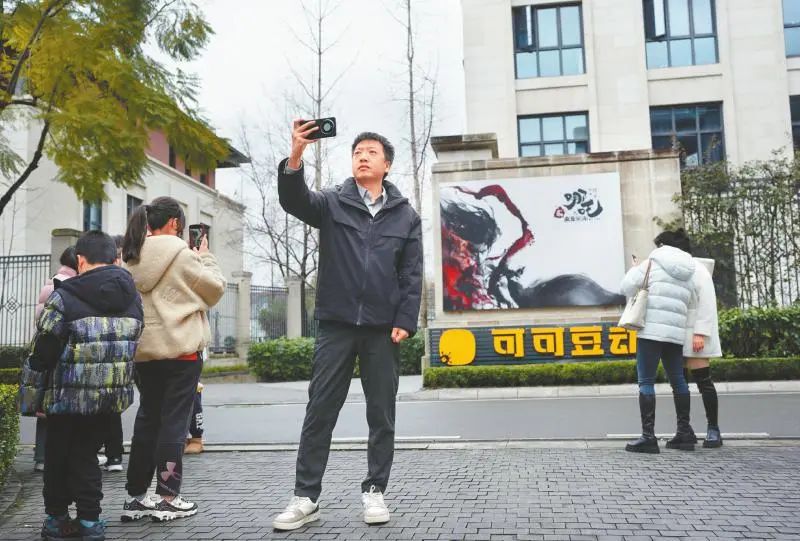 2025年2月8日,影迷在成都可可豆动画影视有限公司前打卡(新华社记者 江宏景 摄)