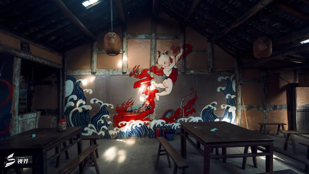 在茶馆的另一处墙面,哪吒的成长历程如同一幅徐徐展开的连环画,生动呈现。从灵珠转世的懵懂,到闹海时的无畏,再到重生后的坚毅,每一个场景都细腻入微。