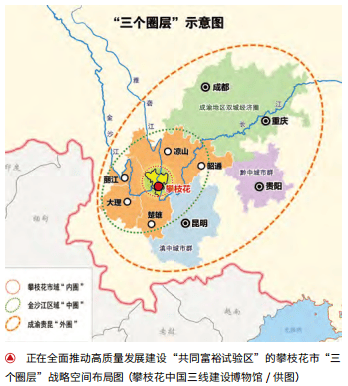 攀枝花开发建设史是中国三线建设史的光辉缩影,“一部攀枝花开发建设史、半部中国三线建设史”道出了三线建设对攀枝花的深远影响。习近平总书记2018年视察四川时指出,新中国成立后,国家在四川布局了一大批重要产业和企业,特别是三线建设,使一大批当时属于顶尖的军工企业、国有企业、科研院所来到四川,这些都是四川发展的宝贵财富。2022年12月22日,中共四川省委、四川省人民政府出台《关于支持攀枝花高质量发展建设共同富裕试验区的意见》,进一步肯定了攀枝花开发建设对区域深度发展的推动作用。2023年1月4日,中共攀枝花市委发布《关于深入学习贯彻党的二十大精神扎实推进共同富裕奋力谱写现代化攀枝花新篇章的决定》,围绕建设川西南滇西北现代化区域中心城市的战略目标,确立了以高质量发展建设共同富裕试验区为战略牵引,以“工业强市、精明增长、城乡融合”为战略重点,扎实推进共同富裕,全面建设幸福美好攀枝花。