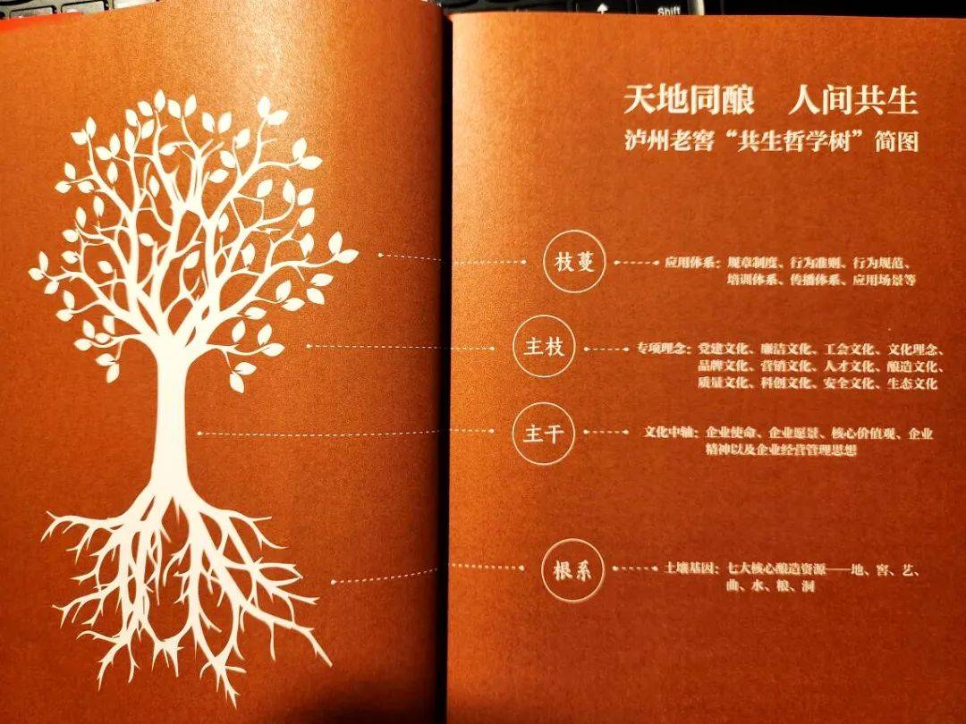 此书显著特点是建立了泸州老窖“共生哲学树”。从该树简图可见,老窖文化具有完整的生命系统——根系、主干、主枝、枝蔓。根系的土壤基因在七大核心酿造资源——地、窖、艺、曲、水、粮、洞。主干是文化中轴,包括企业使命、愿景、价值观、精神和管理思想。主枝体现在专项理念,包括党建、廉洁、工会、品牌、营销、质量、科创、安全、生态等子文化、亚文化。枝蔓是应用体系,体现在行为准则、培训系统、传播系统、应用场景等方面。