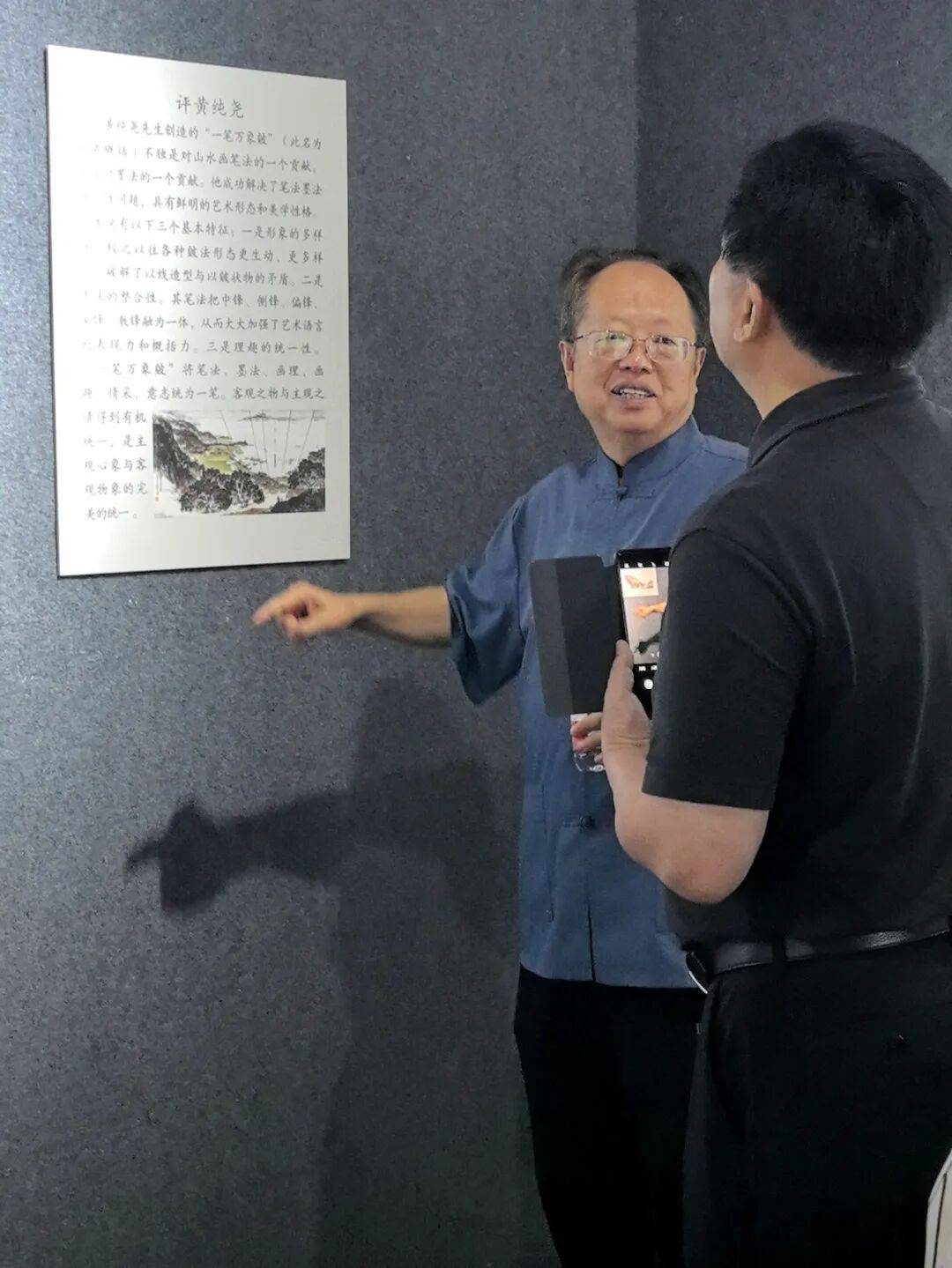 2025年9月6日上午,画家田旭中(左)在画展上向参观者介绍自己老师黄顺尧的绘画特色(蓬州闲士 摄,图源:四川方志图库)