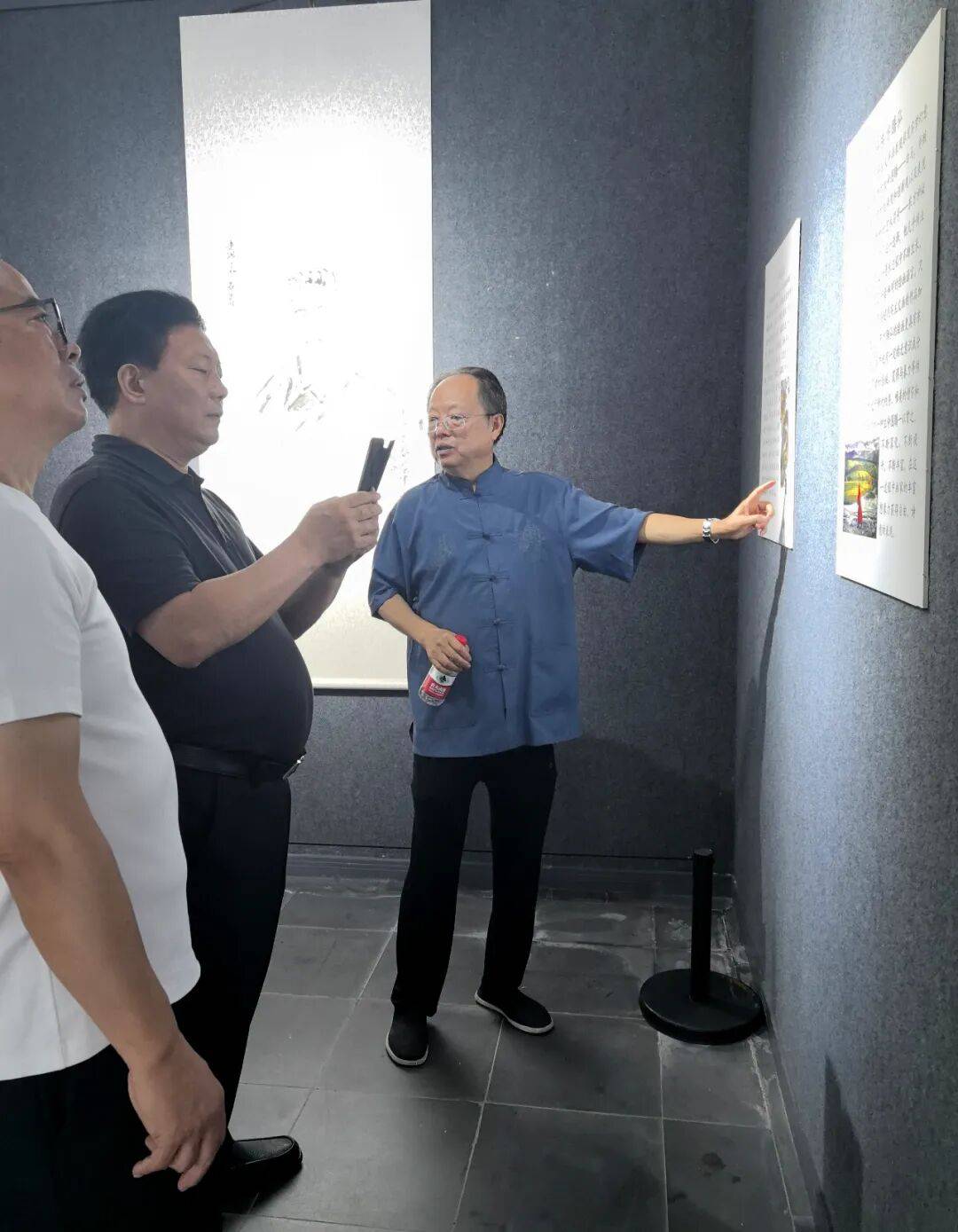 2025年9月6日上午,画家田旭中(右一)在画展上向参观者介绍画家王敬恒的绘画特色(蓬州闲士 摄,图源:四川方志图库)