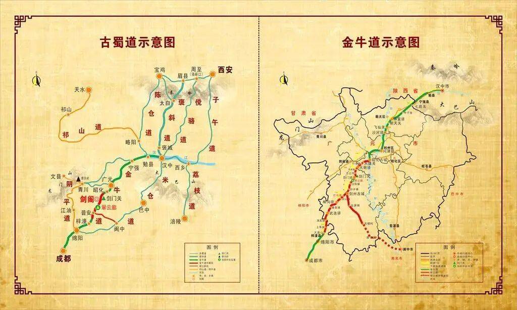 二是蜀人是受利益驱使主动走出去,“与秦塞通人烟”,进行对外交流。利益是决定交流的物质基础,道路使交流成为可能。四川盆地虽然广大,但1.8万平方千米的成都平原,毕竟大大地小于号称“八百里秦川”的关中平原及其相连的广袤的中原大地。关中平原是我国第四大平原,面积为4万平方千米;华北平原是我国第二大平原,面积为30万平方千米。相较而言,成都平原的发展空间的确是太狭窄了。并且三星堆和金沙遗址文化表明,先秦时期的古蜀文明已有很高的发展水平,继续发展受到资源条件的限制,所以必须走出四川盆地,向北进入关中进入中原,这就是开辟金牛道的必然;向南进入夜郎、滇国,这就是开辟五尺道(南方丝绸之路)的根据;向东进入荆楚、百越,这就是开辟长江水道的理由。