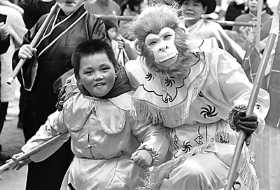 河南省兰考县张庄村的特色民俗节会活动中,演员在巡回展演中扮演“孙悟空”。新华社发