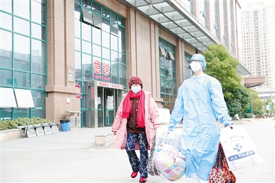 武汉市中心医院的医护人员送患者出院。李蓓摄/光明图片