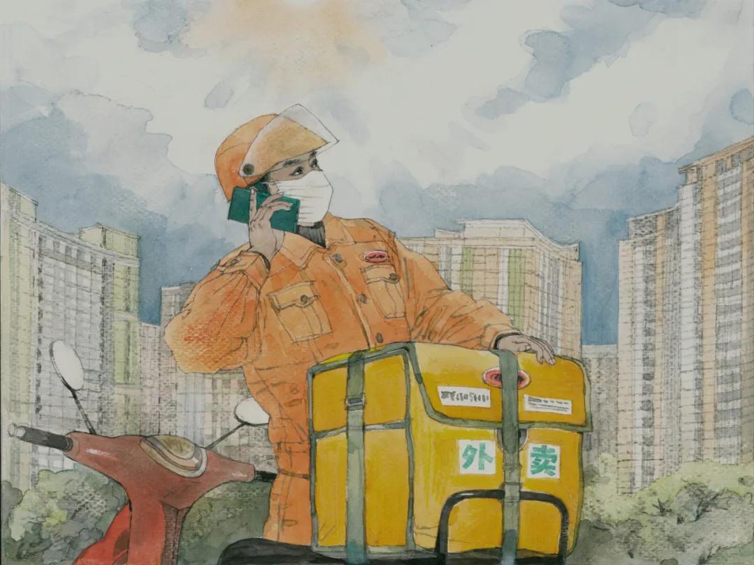 周刚水彩画《不负韶华——我们是青年志愿者》——一抹志愿红,象征着“奉献、友爱、互助、进步”的志愿精神,这既是青春的温度,也是爱的传承。