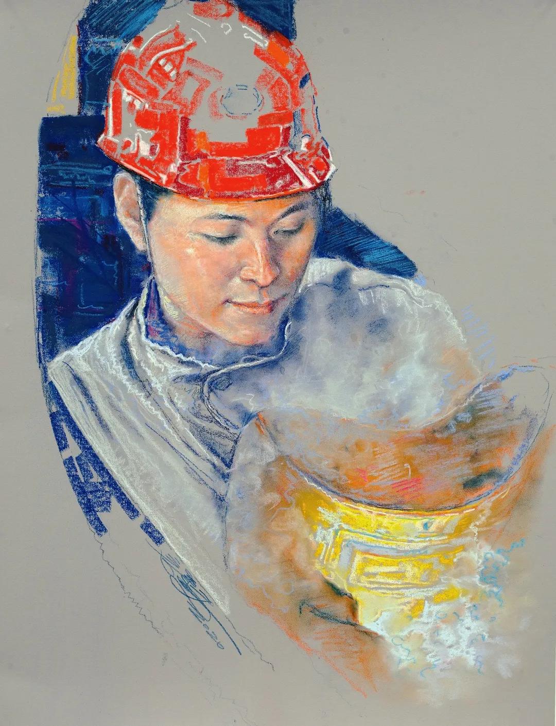 应金飞色粉画《女焊将》——纯净的蓝色,映照出广大工人敬业爱岗的模样。技术工人队伍是支撑中国制造、中国创造的重要基础,凝聚起同心筑梦的磅礴力量。