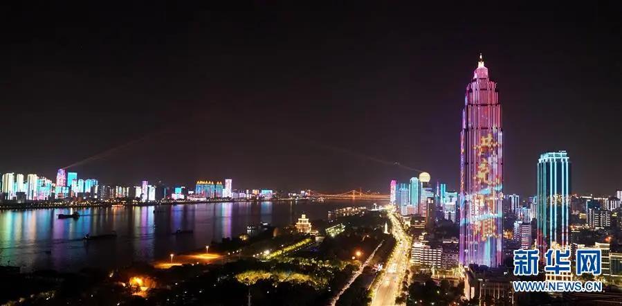 武汉夜晚的“战疫灯光秀”(2020年4月14日新华社记者 王毓国 摄)
