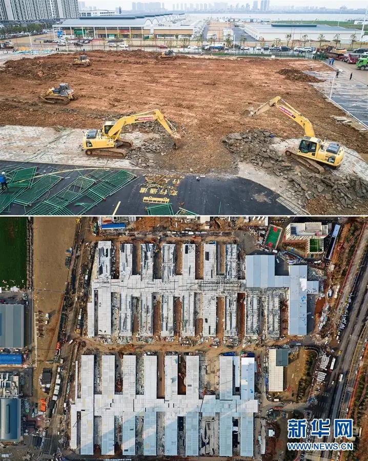 拼版照片:上图是2020年1月26日拍摄的武汉雷神山医院建设工地(无人机照片,新华社记者 肖艺九 摄);下图是2020年2月5日拍摄的武汉雷神山医院建设工地(无人机照片,新华社记者 李贺 摄)。经过十昼夜的奋战,2月6日,雷神山医院正式通过武汉市城建和卫健部门的验收,并开始逐步移交(新华社发)