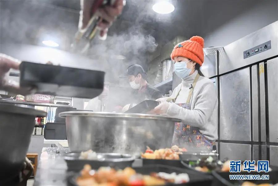 2020年2月26日,籍贯四川广安的“雨衣妹妹”刘仙(右)在分装盒饭(新华社记者 程敏 摄)