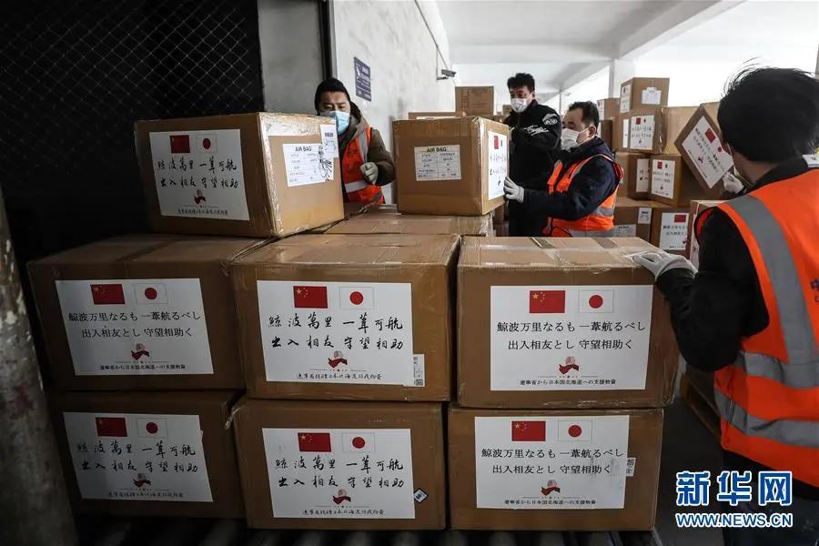 2020年3月15日,辽宁省向日本和韩国捐赠的防疫物资分别搭乘两架中国南方航空的航班运往两国,这是工作人员将完成分类的捐赠物资入库(新华社记者 潘昱龙 摄)