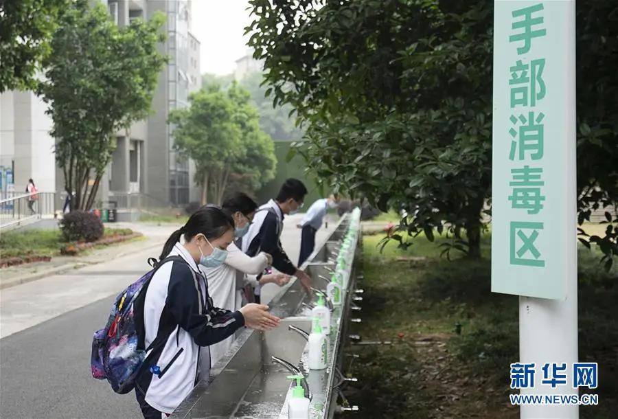 2020年5月6日,武汉首批121所学校高三年级正式复学。在湖北省武昌实验中学,高三年级的学生入校后在手部消毒区洗手(新华社记者 熊琦 摄)