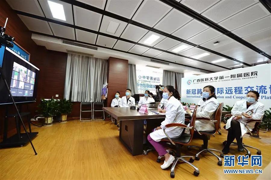 2020年4月20日,广西医科大学第一附属医院专家与柬埔寨医务人员进行视频交流(新华社记者 崔博文 摄)
