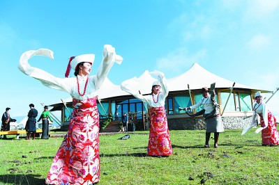 藏族演员在甘南藏族自治州夏河县的草原上表演舞蹈。新华社发