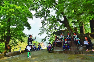 在广西融水苗族自治县杆洞乡党鸠村桂黔乌英苗寨大枫树下,受聘为“双语助脱贫”课外辅导员的大学生梁孟香(左一)为村民培训普通话。新华社发