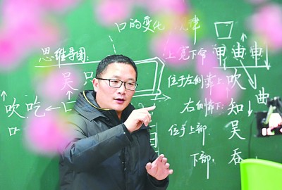 3月6日,河南省夏邑县书法老师张世锋在线上交流粉笔字、钢笔字书写技巧。苗育才摄/光明图片