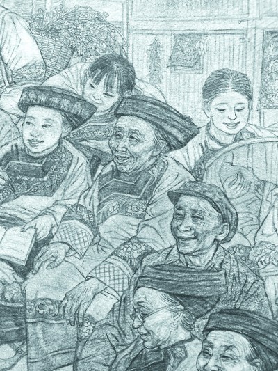 依据专家们的宝贵意见,我最终定格画心为2.4米×4.5米。对不同老人、小孩的五官神韵、年龄特征的把握,屋内各物件结构、质感的表现,及苗绣、蓝印花布的细节特点,我反复推敲,用心刻画。画中人物形象多取自十八洞村参加座谈的村民原型,如何生动自然地重新组合到画面?何红舟老师建议我请同学做模特,现场调整多人物组合动态关系,经过努力,终于对人物之间的透视与衣纹有了较准确的把握。原草图靠近木柱右侧的老者,我经再三斟酌,修改为一位侧过头慈目相看的苗族阿婆,使画面更显温馨,人物构图形成三组大的团块,更增强了画面人物组合大主线构图的韵律与节奏。