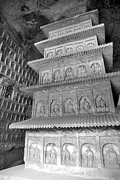 印度佛塔只有一层,进入中国后越变越高。云冈大概有超过120座石刻佛塔,最高的塔有九层,在6号窟。而北魏时期最高的塔,是洛阳永宁寺木塔,基座边长38米左右,塔高约133米,相当于今天40多层楼的摩天大厦,当时仅用3年时间便盖成,可惜盖成之后15年就烧毁了。据北魏杨衒之《洛阳伽蓝记》记载:“永熙三年二月,浮图为火所烧,帝登凌云台望火;遣南阳王宝炬、录尚书长孙稚将羽林一千救赴火所;莫不悲惜,垂泪而去。火初从第八级中平旦大发,当时雷雨晦冥,杂下霰雪,百姓道俗,咸来观火,悲哀之声,振动京邑……火经三月不灭,有火入地寻柱,周年犹有烟气。”