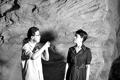 主讲人王南(左)与主持人张小琴在云冈石窟现场交流。