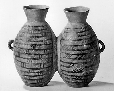 河南郑州大河村遗址出土的仰韶文化晚期彩陶双联壶。资料图片