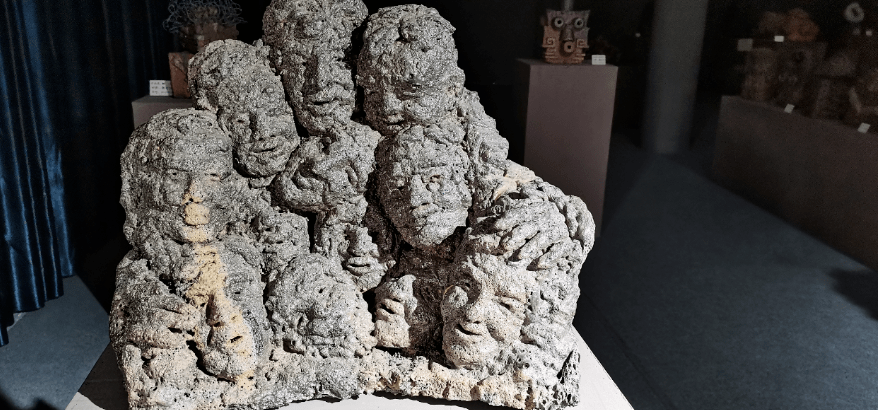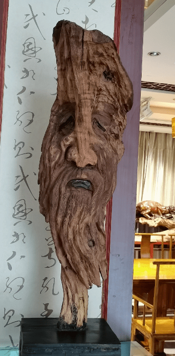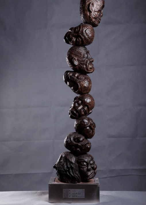 《出头》 唐国富 创作,作品用一块金丝楠整料雕刻了九个重叠的人头。每个人头的表情突出展现了他们内心的世界,体现了人生道路的艰辛和困惑。刀法粗犷、简练