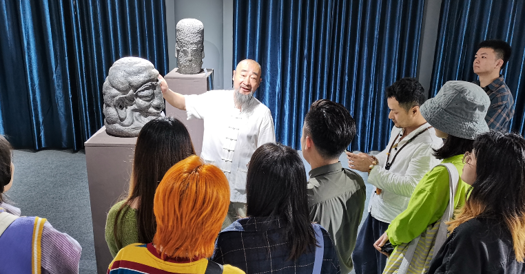 果不其然,在他的“怪头怪脑”工作室里摆放了很多石头。满屋上百件的石头,全部被赋予了人的性格和灵气,每个石头都雕刻了不同人物的五官和表情,或喜悦、或忧愁、或调侃、或深沉,风格迥异。