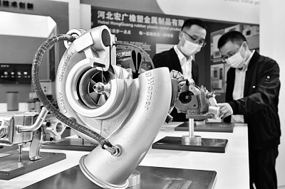 4月21日,在济南市舜耕国际会展中心,与会嘉宾在第二届世界内燃机大会上参观。 新华社发