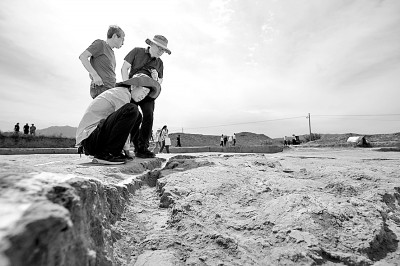 考古工作者在查看陶寺遗址宫城内的一处夯土建筑基址。新华社发