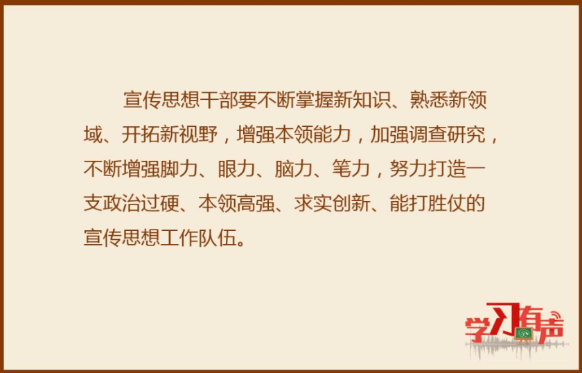 2018年8月21日,习近平总书记在全国宣传思想工作会上指出,宣传思想干部要不断掌握新知识、熟悉新领域、开拓新视野,增强本领能力,加强调查研究,不断增强脚力、眼力、脑力、笔力,努力打造一支政治过硬、本领高强、求实创新、能打胜仗的宣传思想工作队伍。