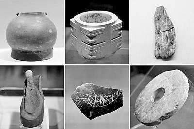 良渚文化遗址出土的(上排左起)黑陶器、玉琮、木屐、(下排左起)漆器、陶片和玉璧。新华社发