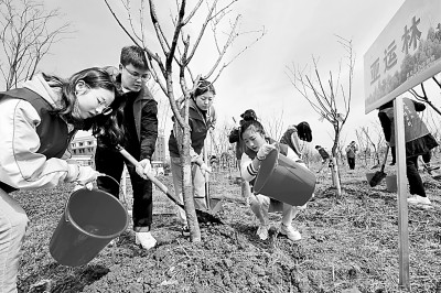 3月10日,浙江工业大学生物工程学院的学生在湖州市德清县康乾街道秋北村义务植树。新华社发