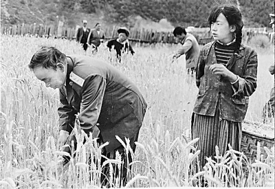 1990年,阴法唐乘汽车从青藏公路赴西藏,途中和群众收割青稞。