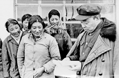1982年10月24日,阴法唐在那曲中学查看学生作业。