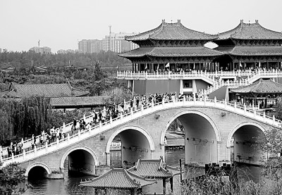 游客在开封清明上河园景区游览(2016年摄)。新华社发