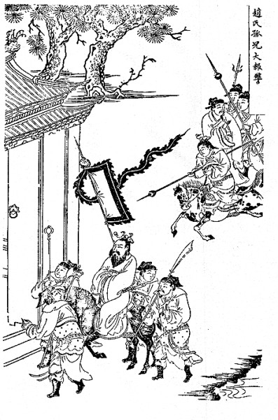 《赵氏孤儿》,全名《冤报冤赵氏孤儿》,又名《赵氏孤儿大报仇》,是元杂剧著名悲剧之一。这部剧所依据的历史事件,最早的较详细叙述见于春秋时期的《左传》,只是当时记载的情节相对简略,而且其中几个关键人物(例如最大反派屠岸贾、保护赵氏孤儿的关键人物程婴和公孙杵臼)并无记载,因此此事在后世所演绎故事的真实程度,至今仍被学界讨论;在西汉司马迁所著的《史记·赵世家》和刘向所著的《新序》《说苑》中,有了更为详细的记述。根据《史记》记载,此故事发生在春秋时期的晋国,晋景公当国期间重用大臣屠岸贾,屠岸贾与另一大臣赵朔有仇,他怂恿晋景公以赵朔父亲和叔叔以往过失的名义惩罚赵家。将军韩厥力劝未果,偷偷通知赵朔逃跑,赵朔不肯,请求韩厥保全赵氏子弟以继香火。屠岸贾假传晋景公命令,杀害赵家满门,赵朔的妻子已经怀孕,因为是晋成公姐姐,躲在宫中逃过一劫。不久后,赵朔的妻子生下一个男孩即赵氏孤儿。为了躲过屠岸贾的追杀,她把婴儿交给赵朔的朋友程婴。在赵朔门客公孙杵臼的配合下,程婴抱来别人的婴儿顶替赵氏孤儿。然后,公孙杵臼故意让程婴向屠岸贾举报自己藏匿赵氏孤儿,程婴依计向屠岸贾举报,宣称是贪图千金之赏,带人抓捕公孙杵臼及婴儿,随后将其处死,从此,赵氏孤儿得脱。程婴把赵氏孤儿带到深山老林中,当作儿子抚养教育。赵氏孤儿长大之后就是赵武,他得到了韩厥及晋景公的帮助,最终回到朝中攻灭屠岸贾,报了深仇大恨,赵氏复兴。在赵武成人之后,程婴向众人告辞,说如今一切安定,他要去向赵氏祖先以及公孙杵臼报告这个好消息,于是自杀。