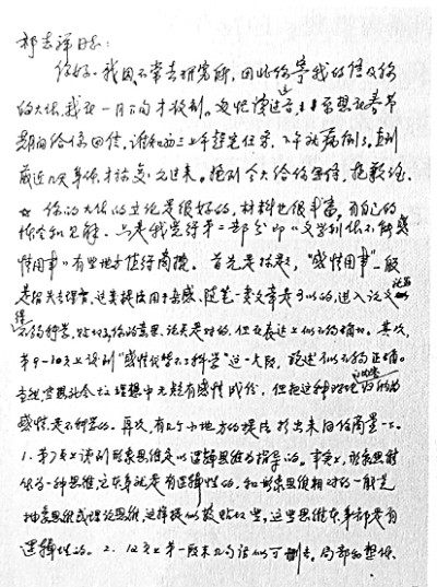 1983年5月11日来信说:“你给我的稿子和信都已收阅。因为我实在较忙,所以只能趁个空子给你写回信,耽误了时间,十分抱歉。”“我室今年招了几个研究生,有古代文论的,有文艺理论的,明后年是否有名额,尚难预料,即使有,我起码要到后年方招。前两年指导一个研究生,相当花我力气,结果影响了我的工作。这两年,我想集中一些力量,把自己的几个项目搞出来,因此我甚感时间的紧迫,不可能在别的方面分心。”“五月下旬,我又得放下自己的工作,参加《大百科》文艺理论条目的定稿工作;六月准备发掉几部译稿(请人翻译的),然后又要转入一项集体工作《文学原理》。此事已说了几年,今年是箭在弦上,不得不发了。三个月闭门读书,三个月写出提纲(四人合作)。如今年能写出提纲,明年初将印寄各地,征求意见,再修改,明年下半年和后年,全部写完,最后定稿。《文学原理》增加一些新观点,完全是可以的,但问题在于体系,这是一个难题。”