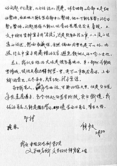 再如1982年4月9日的来信:“三月中旬,您的稿子和信都收到了。稿子我当时就读了,后来由于工作比较紧张,月底又要出去开会,做些准备,因此就耽搁了给您回信。前日刚自广州回来,又翻阅了您的稿子,下面我想简单谈些意见。”1982年7月8日的来信:“五月末、六月下旬两次来信和《试析平淡蕴含功力》一稿,均已收到,请勿挂念。这段时间,我十分繁忙,改稿、看校样,看《大百科》稿子,会议,加上室里的一部分工作,真是难得有喘息机会。因此六月初接你的信和《盐城师专》上的大作后,迟迟未能复信,十分抱歉。”1982年8月16日的来信:“七月初接你《试析平淡蕴含功力》一稿后,我一直很忙,加之因一集体项目集中了一段时间,你的大作直到最近我才读了两遍。”值得说明的是,《试析平淡蕴含功力》一文很长,300字一页的稿纸写了60多页。钱先生看了两遍,不知花了多少精力!