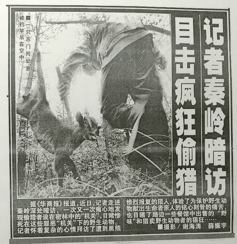 一只秦岭的野生保护动物苏门羚幼崽被盗猎分子捕获,牠的后腿被吊空中,盗猎者正用棍棒狠狠抽打这只可怜无辜的幼崽欲置其于死地。幼羚被打的皮开肉锭口吐鲜血,牠一双美丽的圆眼望着打牠的人,仿佛在问:“人啊,我没做错什么!为什么杀我?”这一幕,被蹲守记者在盗猎者身后拍到(据《华商报》)