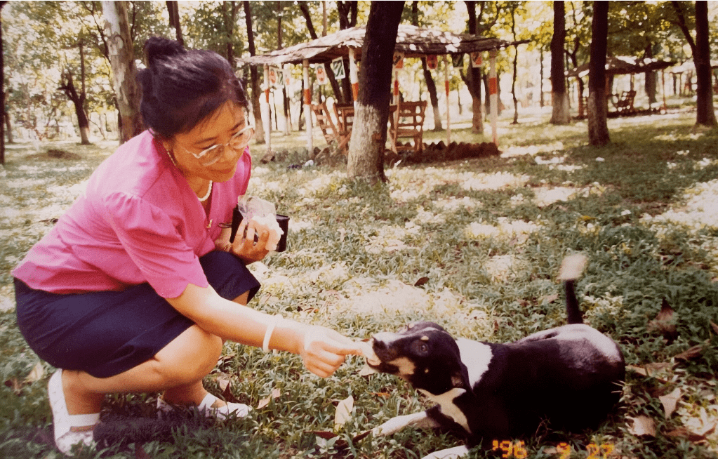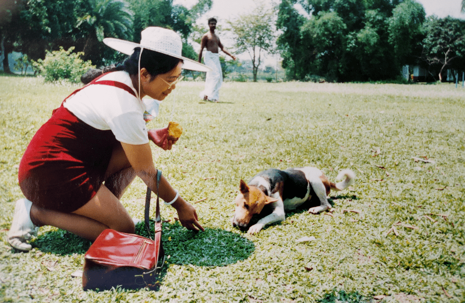 蔡玲在给一只流浪狗喂食(1996年9月27日摄于孟加拉国)