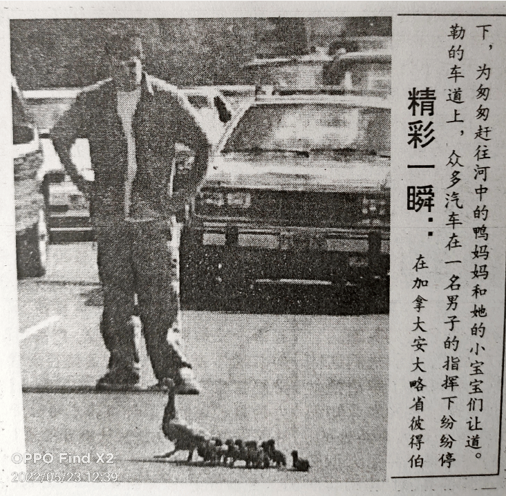加拿大安大略省彼得伯勒市,众多汽车在一名过路男子的指挥下纷纷停車等侯,让鸭妈妈和牠身后的鸭宝宝先过马路。这温暖的一幕我在欧洲多次邂逅