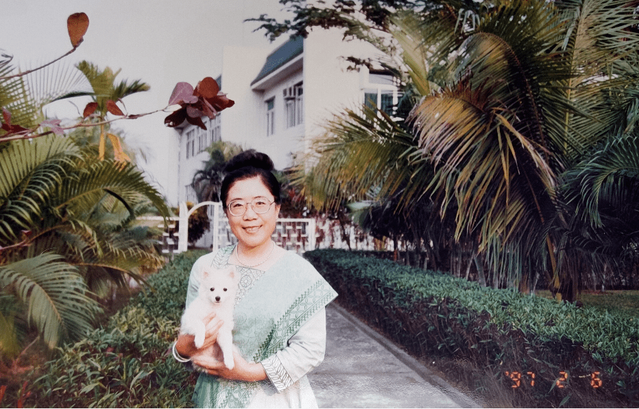 1997年,蔡玲身着孟加拉国女常服怀抱受救小狗 〔摄于中国驻孟使馆通向经商参处(身后白楼)的小路 〕