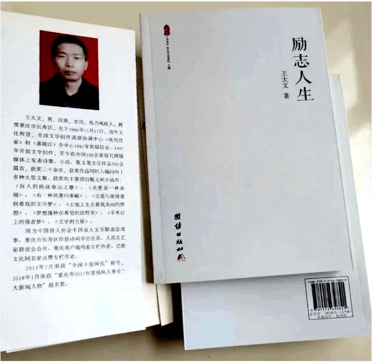 王大文,男,生于1966年,农民,视力残疾人,中国盲协盲人文学委员会会员,重庆市作家协会会员,“作家家园”微信公众号主编。著有散文集《励志人生》。1982年开始文学创作,在中国作家网、中国诗歌网、《重庆日报》《重庆法制报》《重庆杂文》等媒体发表诗歌、小说、散文等文学作品500余篇(首)并多次获奖,获奖作品被收入多本文集。